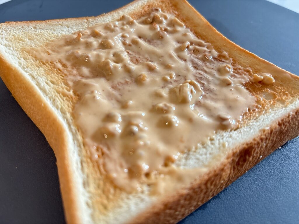 焼いたパンに塗ってみると、するする溶けてピーナッツの粒立ちがよくわかる!